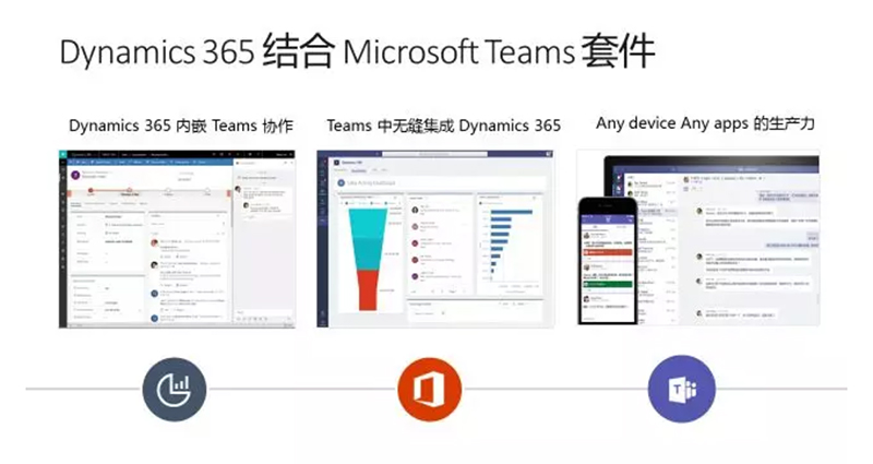 “Dynamics 365 内嵌 Microsoft Teams 协作,Microsoft Teams 中无缝集成 Dynamics 365。双向深度打通,让沟通插上翅膀。”