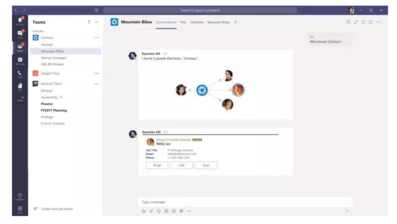 通过内置于 Dynamics 当中的 Teams 组件,可以快速与客户进行沟通联络,发送语音、信息、文件和三方程序等等。