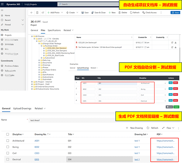 风管项目涉及大量项目文档,合理规划项目文档库和确保文档安全是客户最关心的问题。由于 Dynamics 365 原生不支持 PDF 文档的合并与拆分,所以,项目文档管理成为开发过程中一个较大的挑战,主要功能包括: