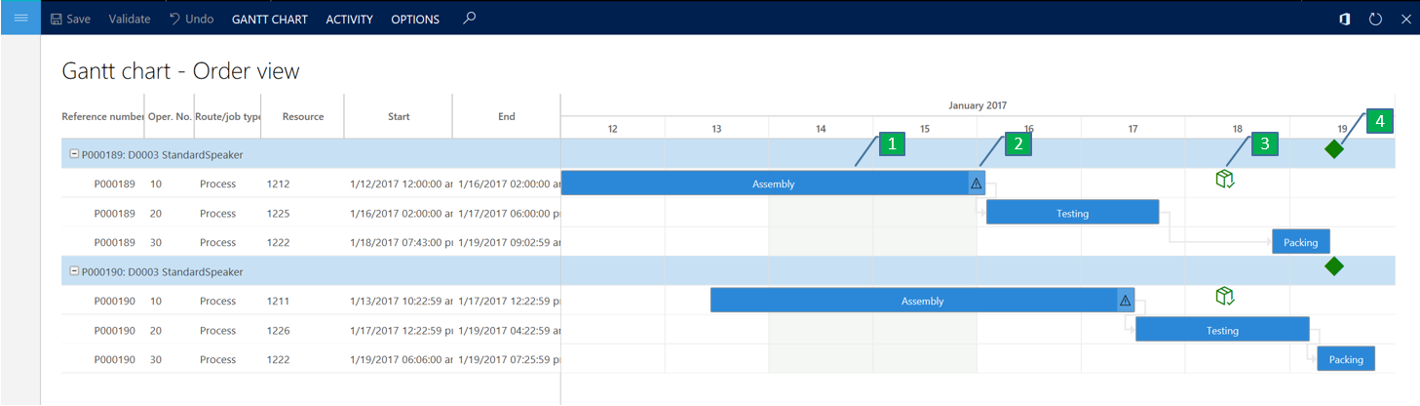 下图显示的甘特图显示具有以下关键元素的 订单视图 和 资源视图:
