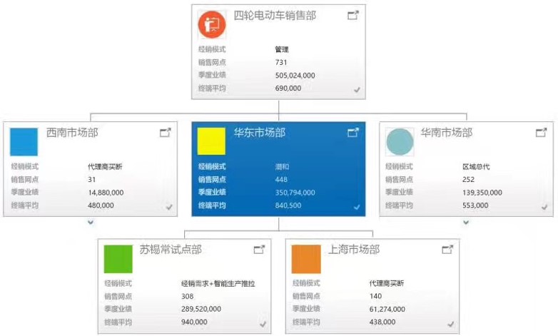 Dynamics 365中的关系层次结构表面上来看是一个简单的概念。它可以归结为父/子关系,也就是1:N的关系。例如,“四轮电动车销售部”是指在不同地点有多个分支机构的一条产品线管理单元。使用可用的层次结构选项,可以透视化帐户之间的相关性关系。例如,在“西南市场部”、“华南市场部”、“华南市场部”的父帐户都是这条总部的这条产品线管理单元。我们只需单击层次结构图标,就可以看到帐户的层次结构以及它们的关系描述。通过单击任何一个子公司,层次结构视图将为我们展开这个子公司与我们现在的交易记录。