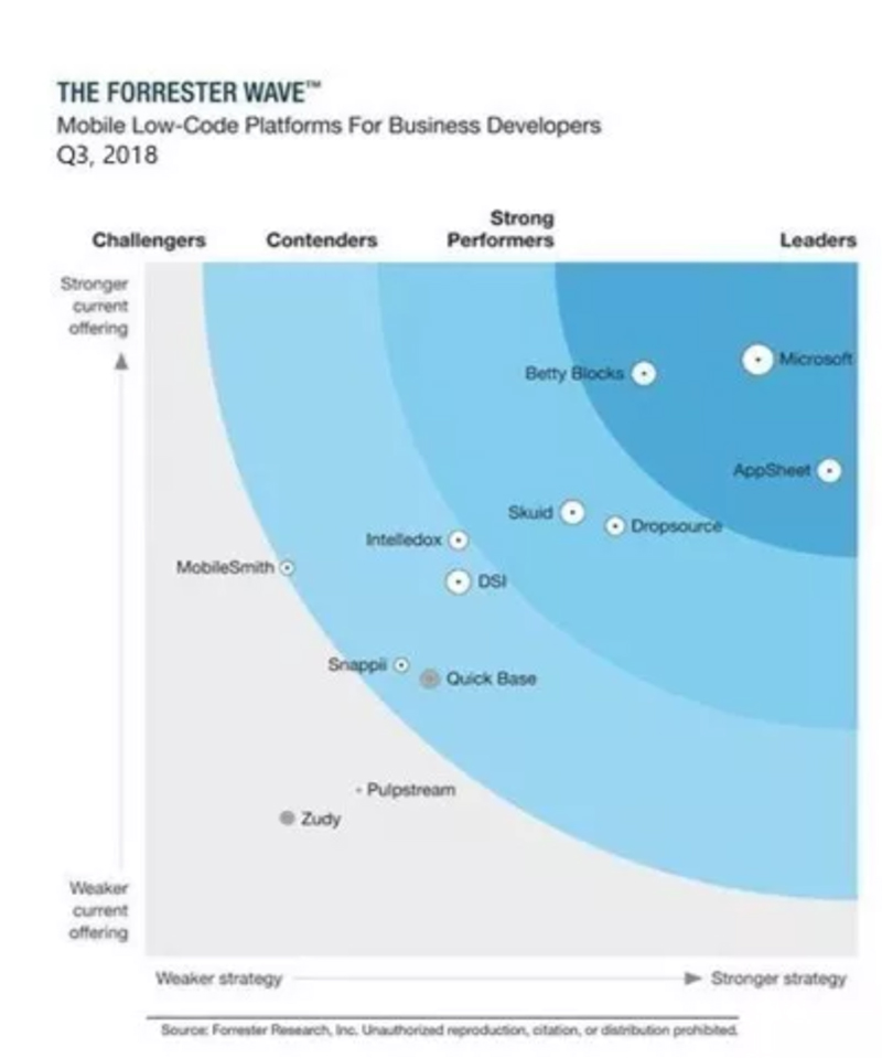 近日,知名的独立技术和市场调研机构 Forrester 发布《The Forrester Wave:Mobile Low-Code Platforms for Business Developers, Q3, 2018》,微软 PowerApps 因在创新技术与市场策略的优异表现强势登陆领导者(Leaders)象限。