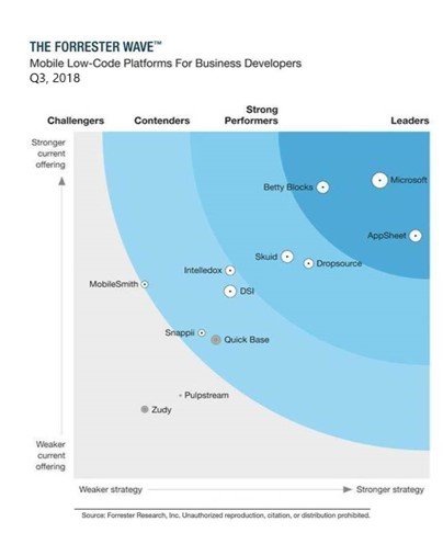 同期,独立的技术和市场调研公司Forrester Research发布了2018年第三季度面向业务开发人员的移动低代码平台(Mobile Low-Code Platforms for Business Developers)的评估报告,微软 PowerApps 处于领导者(Leaders)地位。
