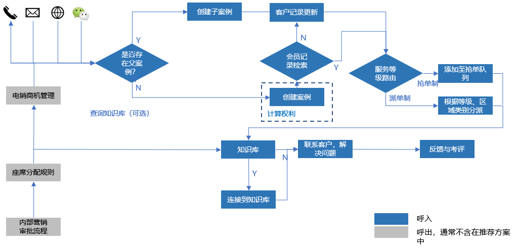 全渠道服务管理 | 为客户提供多种问题提交渠道(网站、邮件、电话或微信),客服人员通过案例库、知识库等资源在第一时间为客户提供最佳的方案 |